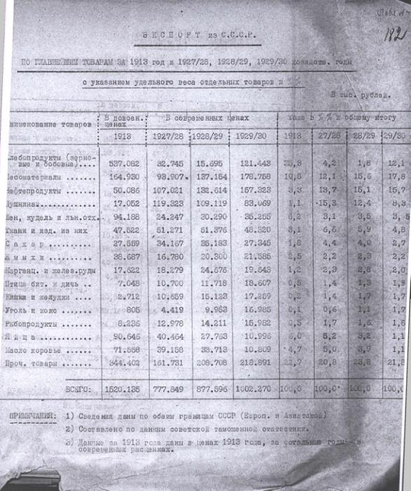 - Экспорт и импорт СССР за 1913 г. и 1927/28, 19228/29 и 1929/30 хозяйственные годы с указанием удельного веса отдельных товаров.