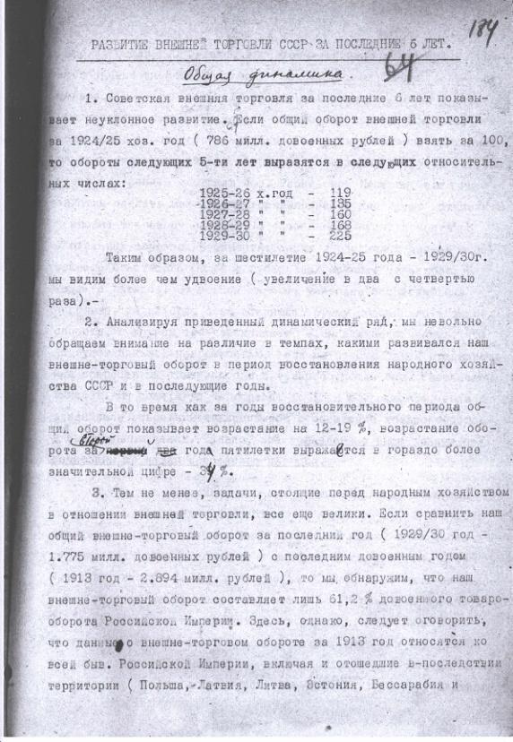 Аналитическая записка НКВТ о развитии внешней торговли с 1924 по 1930 гг.
