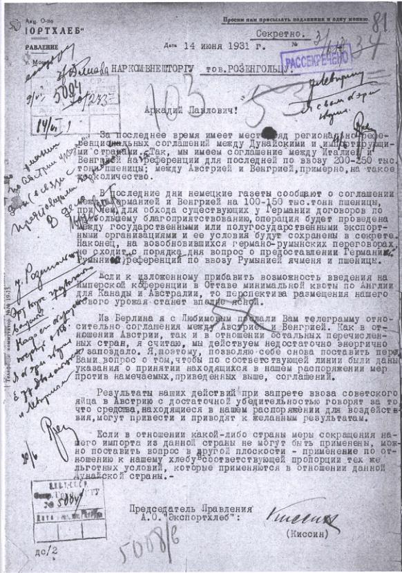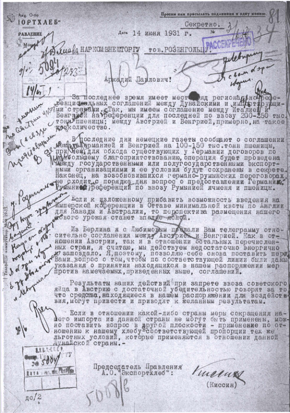 Письмо председателя правления Экспортхлеба Киссина о состоянии европейского рынка зерна. 14 июня 1931 г.
