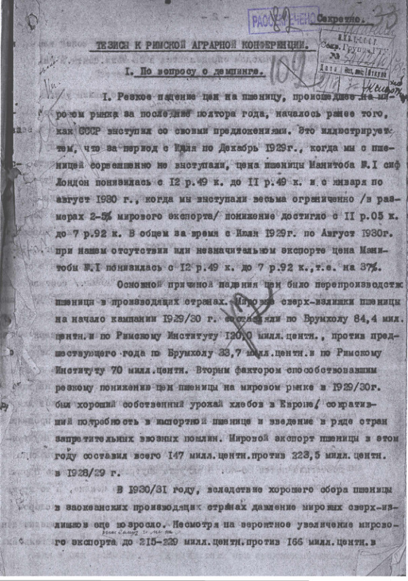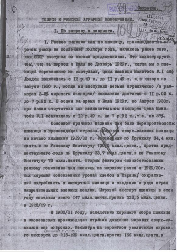 Тезисы советской делегации к Римской Аграрной конференции. 2 марта 1931 г.