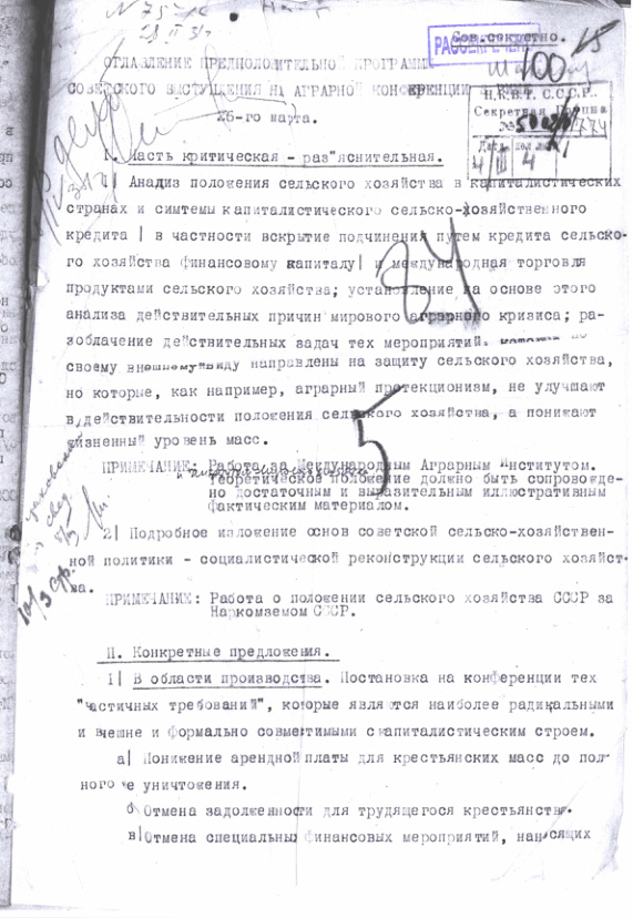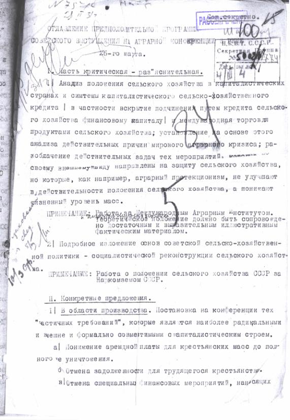 Оглавление предположительной программы советского выступления на аграрной конференции в Риме. 28 февраля 1931 г.