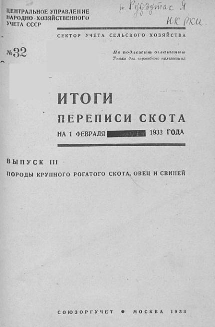 Итоги переписи скота на 1 февраля 1932 г. Выпуск 3.