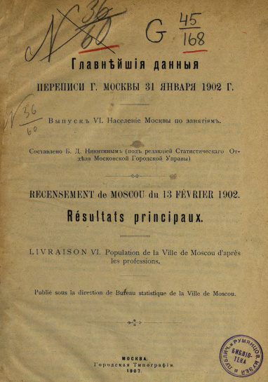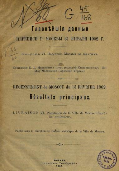 Главнейшие данные переписи г. Москвы 31 января 1902 г. Выпуск VI. Население Москвы по занятиям