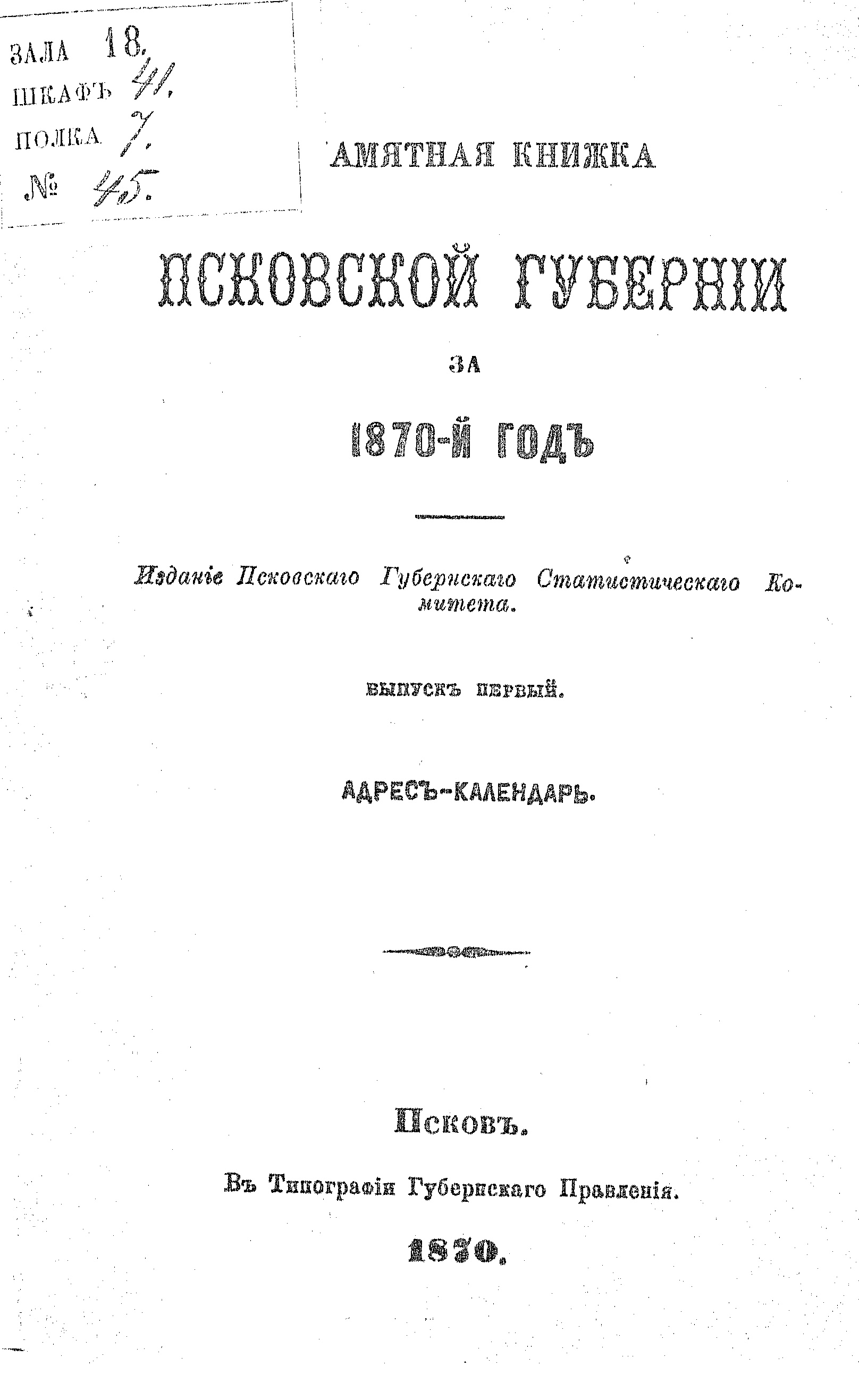 Псков, Типография Губернского Правления, 1870