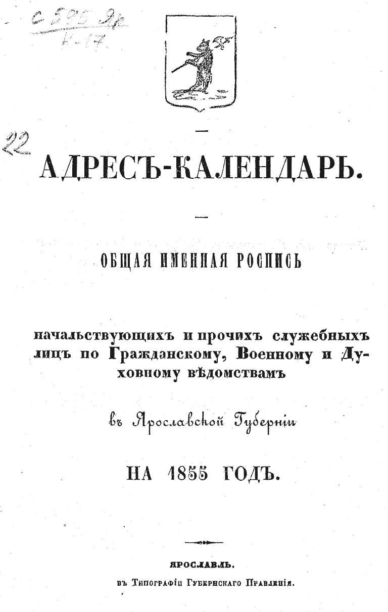 Адрес-календарь. Общая именная роспись начальствующих и прочих служебных лиц в Ярославской губернии на 1855 год