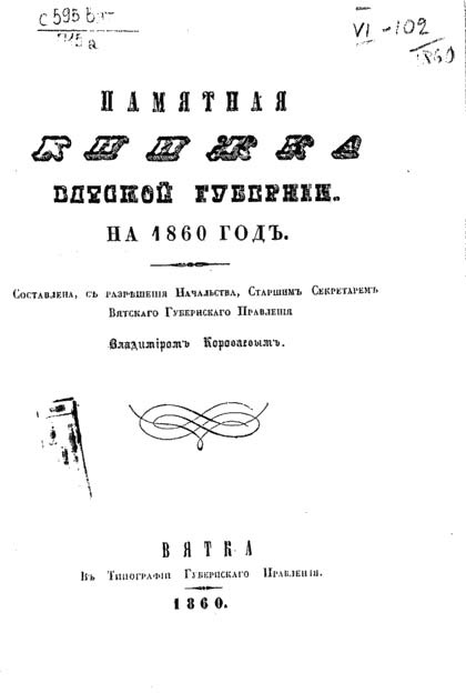 Вятка. В Типографии Губернского Правления, 1860