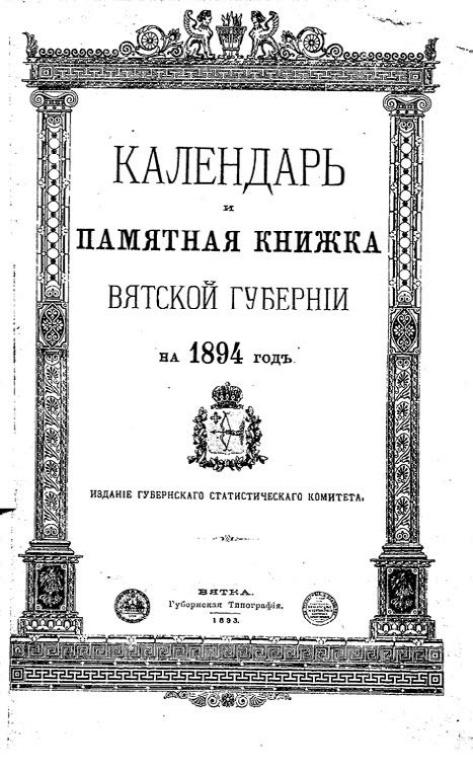 1894. Календарь и Памятная книжка Вятской губернии на 1894 год