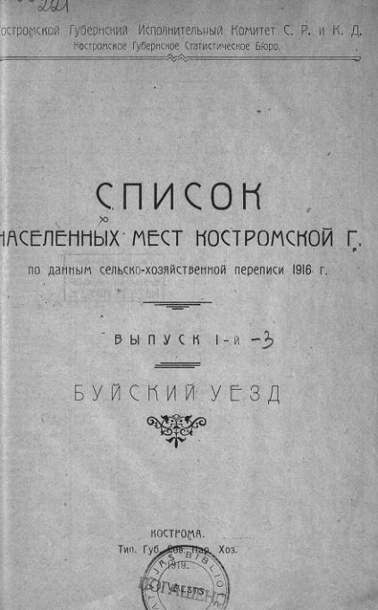 1919 - Список населенных мест Костромской губернии по данным переписи 1916 года. Вып. 1. Буйский уезд.