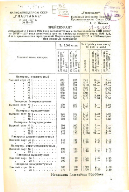Прейскурант цен на папиросы производства предприятий Наркомпищепрома СССР и НКПищепромов союзных республик. 16 мая 1937 г.