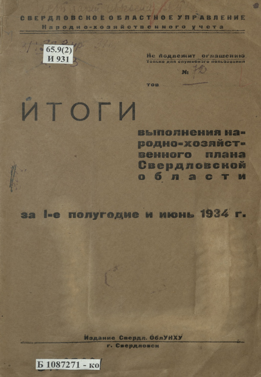 Итоги выполнения народно-хозяйственного плана Свердловской области за 1-е полугодие и июнь 1934 года