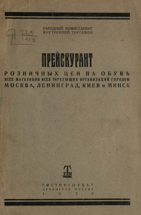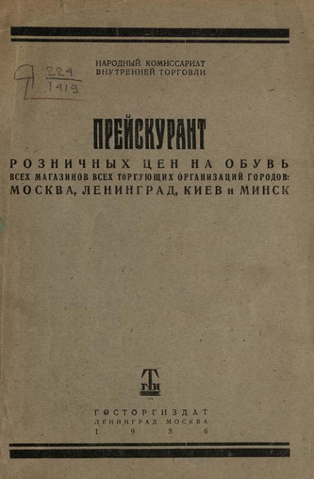 Прейскурант розничных цен на кожаную обувь всех магазинов всех торгующих организаций городов: Москва, Ленинград, Киев и Минск. 1936 г.