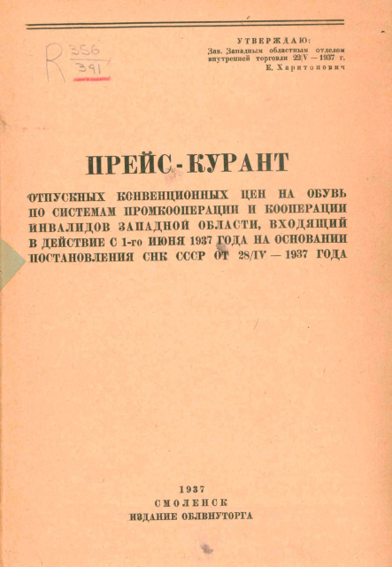 Прейс-курант отпускных конвенционных цен на обувь по системам промкооперации и кооперации инвалидов Западной области, входящий в действие с 1 июня 1937 года на основании Постановления СНК СССР от 28/IV – 1937 года
