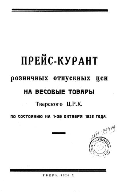 Прейс-курант розничных отпускных цен на весовые товары Тверского ЦРК по состоянию на 1-ое октября 1926 г.