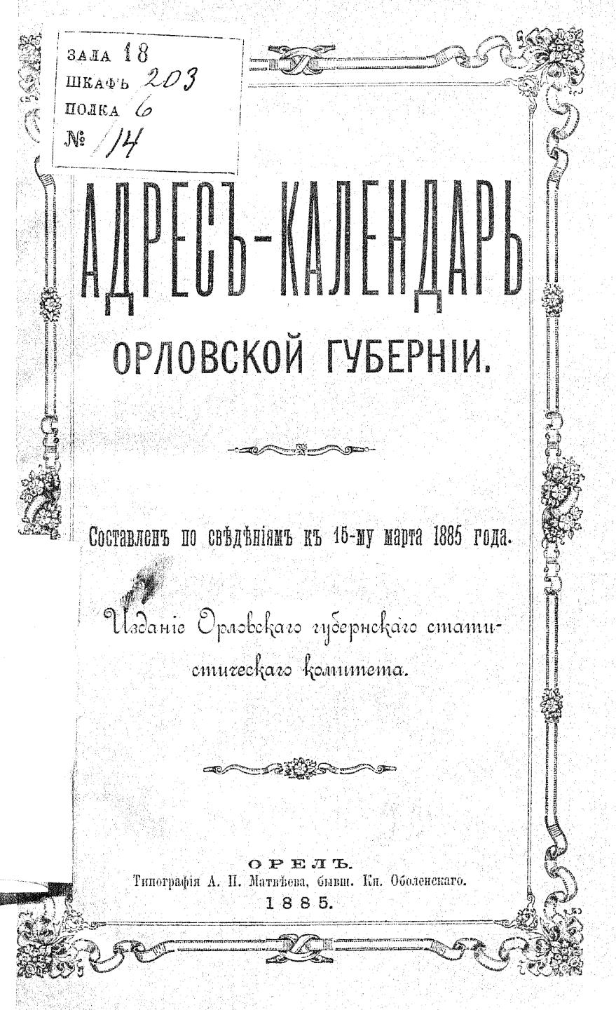 Орёл. Типография А.П. Матвеева, бывш. князя Оболенского, 1885