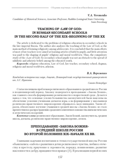 Преподавание «Закона Божия» в средней школе России во второй половине XIX–начале ХХ вв.
