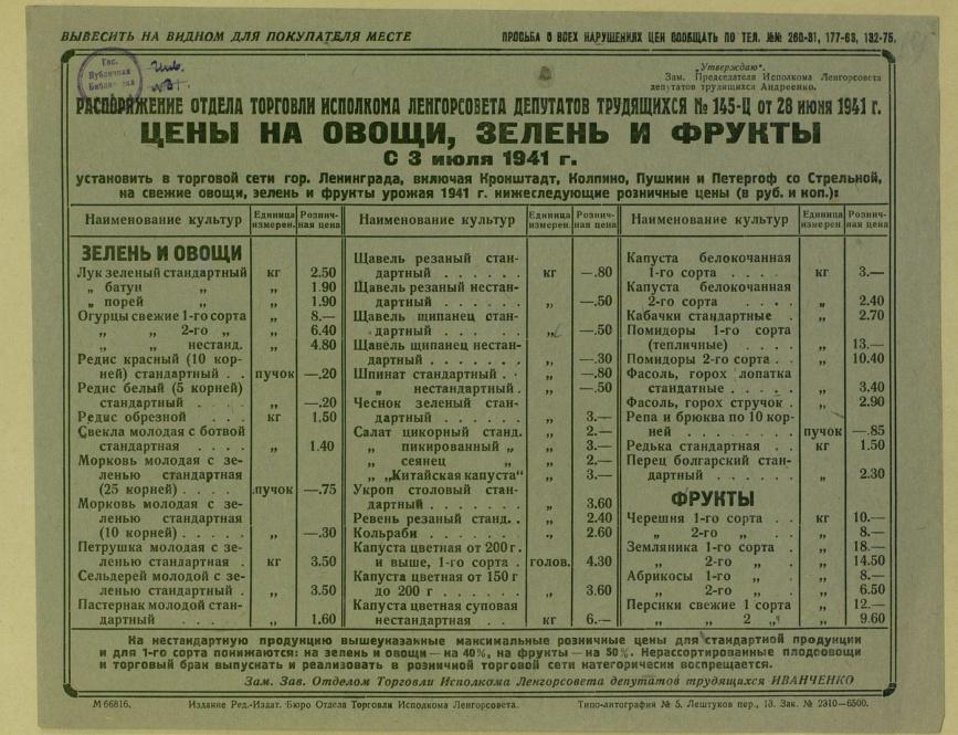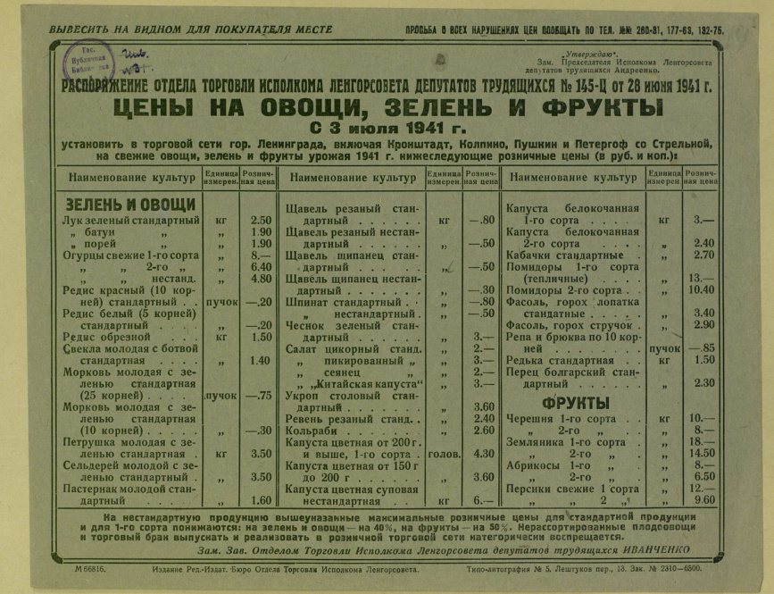 Цены на овощи, зелень и фрукты с 3 июля 1941 г. Распоряжение отдела торговли исполкома Ленгорсовета депутатов трудящихся № 145-Ц от 28 июня 1941 г.