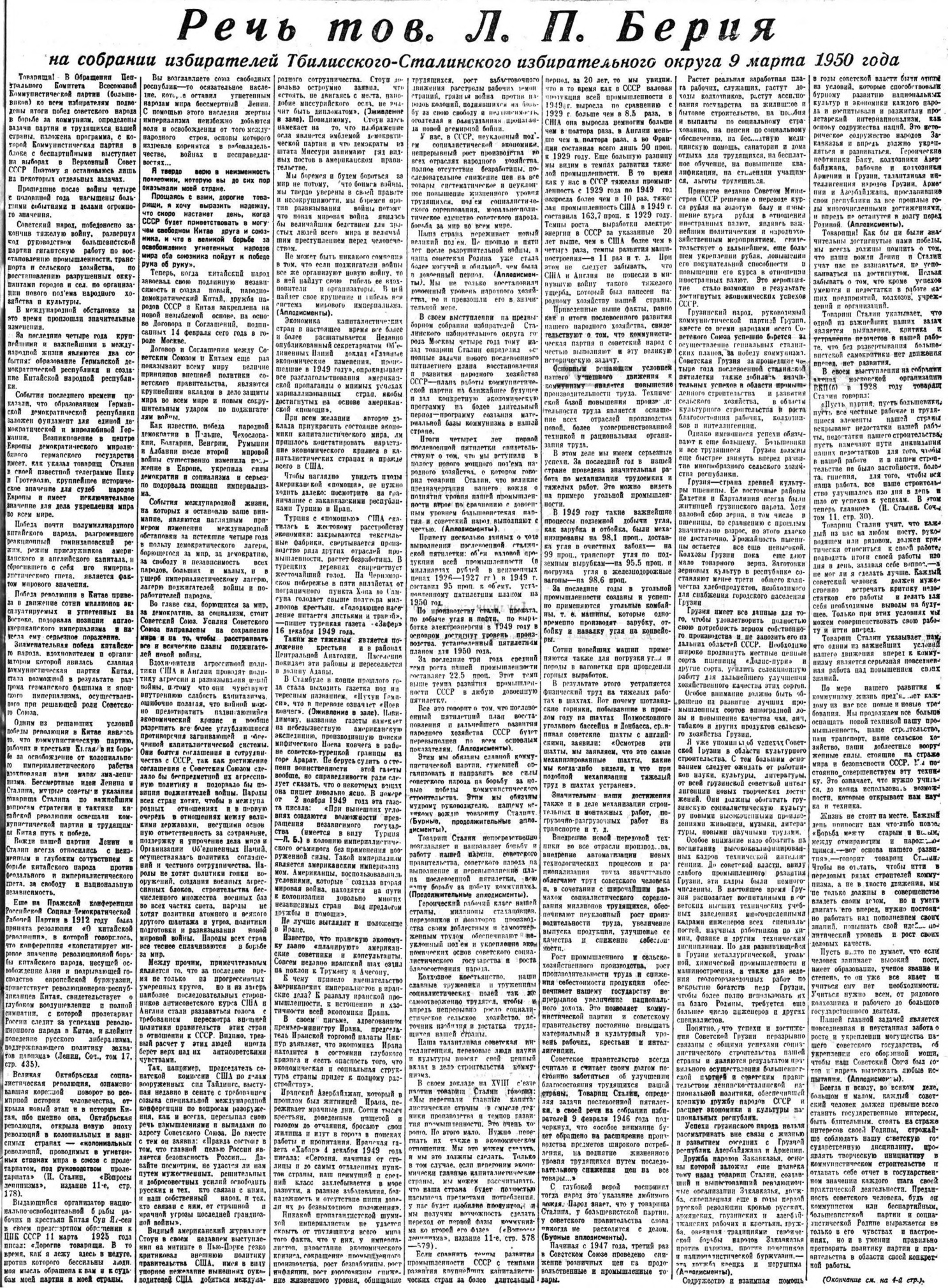 Речь тов. Л.П. Берия на собрании избирателей Тбилисского-Сталинского избирательного округа 9 марта 1950 г.