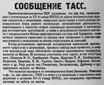 Сообщение ТАСС о высылке из Москвы Троцкого Л.Д. и других оппозиционеров. 1928 г.