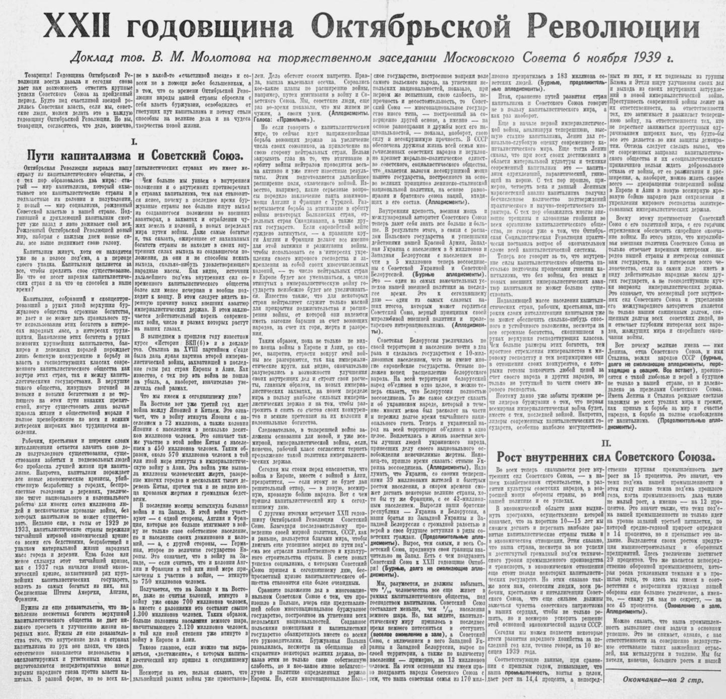 Доклад тов. В.М. Молотова на торжественном заседании Московского Совета 6 ноября 1939 г. XXII годовщина Октябрьской революции.