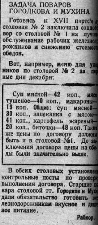 Цены и ассортимент в столовой № 2 депо ОРС г. Вологда. Декабрь 1933 г.