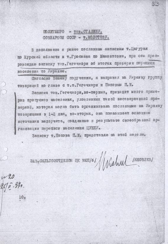 - Записка зав. сельхозотделом ЦК ВКП(б) Я.А.Яковлева И.В. Сталину и В.М. Молотову с приложением отчета М.И. Гегечкори о результатах проверки переписи населения 1937 г. в УССР. 25 февраля 1937 г.