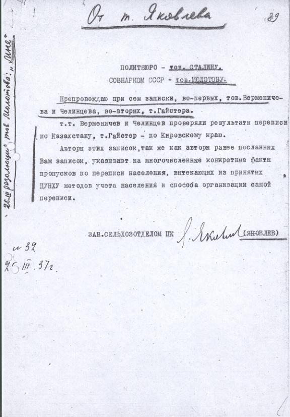 - Записка зав. сельхозотделом ЦК ВКП(б) Я.А.Яковлева И.В. Сталину и В.М. Молотову с приложением отчета А.И.Гайстера о результатах проверки переписи населения 1937 г. в Кировской области. 25 марта 1937 г.