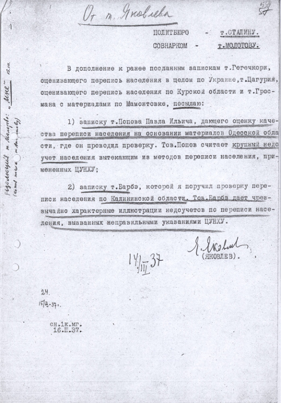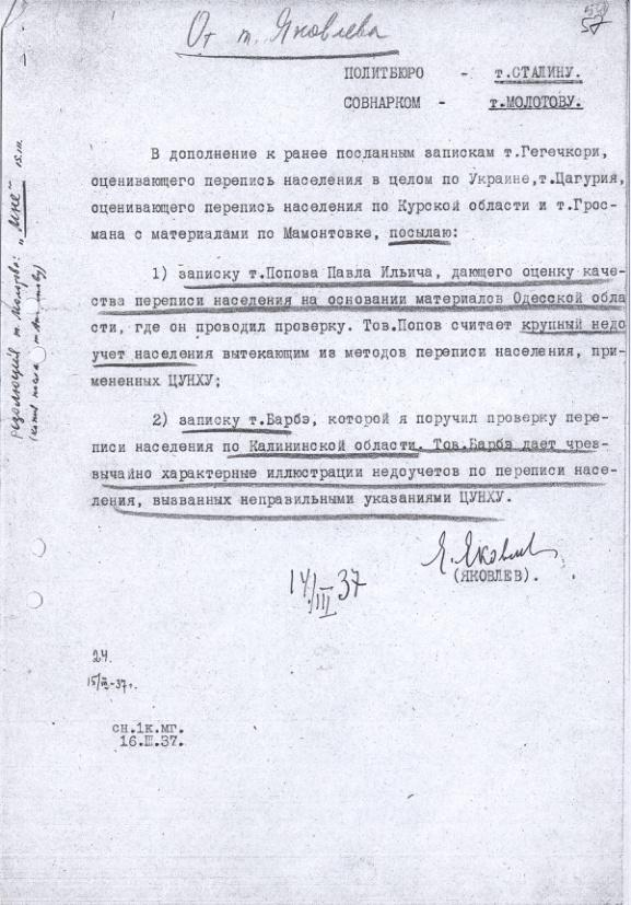 - Записка зав. сельхозотделом ЦК ВКП(б) Я.А.Яковлева И.В. Сталину и В.М. Молотову с приложением отчетов П.И. Попова и А. Барбэ о результатах проверки переписи населения 1937 г. в Одесской и Калининской областях. 14 марта 1937 г.