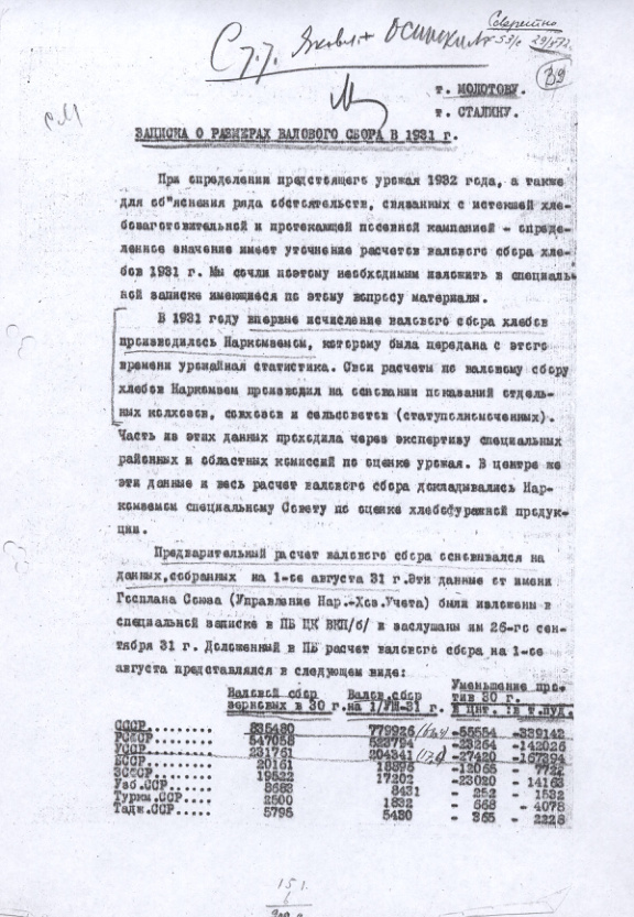Записка начальника ЦУНХУ В.В. Осинского о размерах валового сбора зерновых в 1931 году. 29 мая 1932 г.