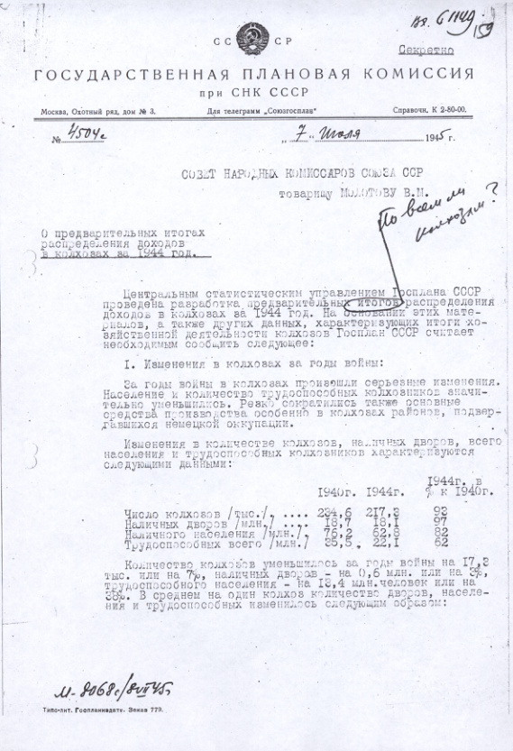 - Записка зам. председателя Госплана СССР С. Демидова и начальника ЦСУ В.Старовского о предварительных итогах распределения доходов в колхозах в 1944 г. 7 июля 1945 г.