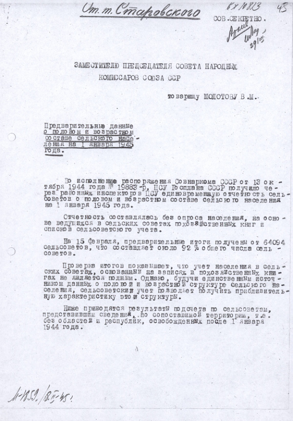 - Справка начальника ЦСУ В.Н. Старовского о предварительных данных по половому и возрастному составу сельского населения СССР на 1 января 1945 г.