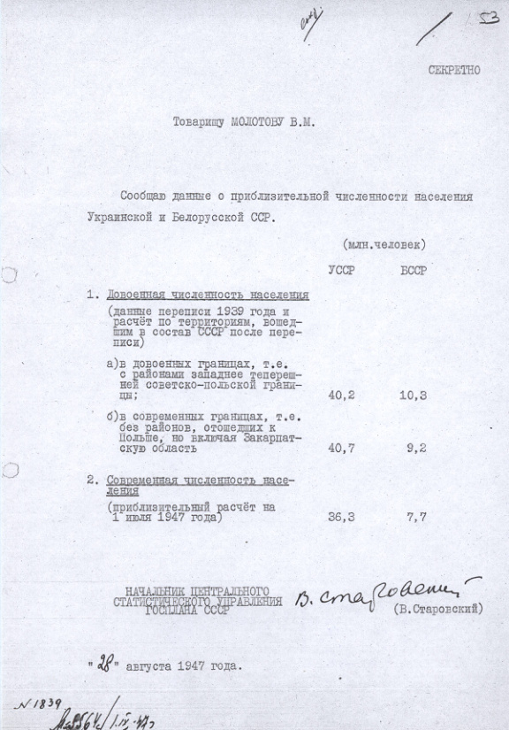 Справка начальника ЦСУ В.Н. Старовского о довоенной и численности населения БССР и УССР на 1 июля 1947 г.