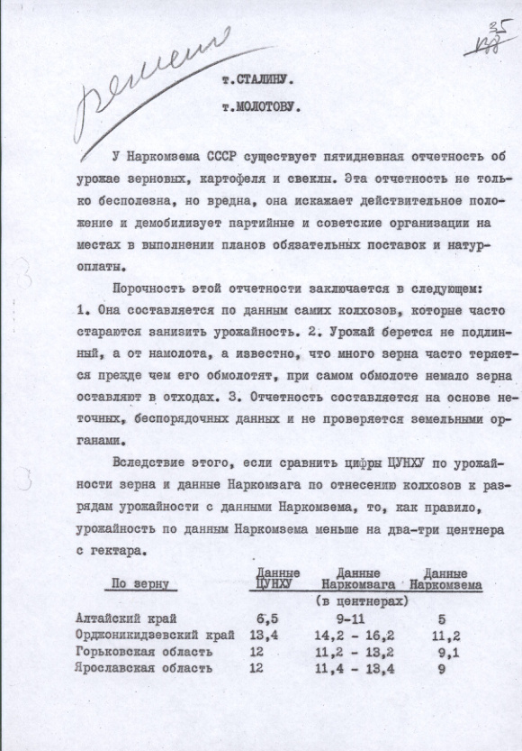 Записка с предложением об отмене пятидневной отчетности и запрете использования данных Наркозема по определению урожайности. 7 октября 1940 г.