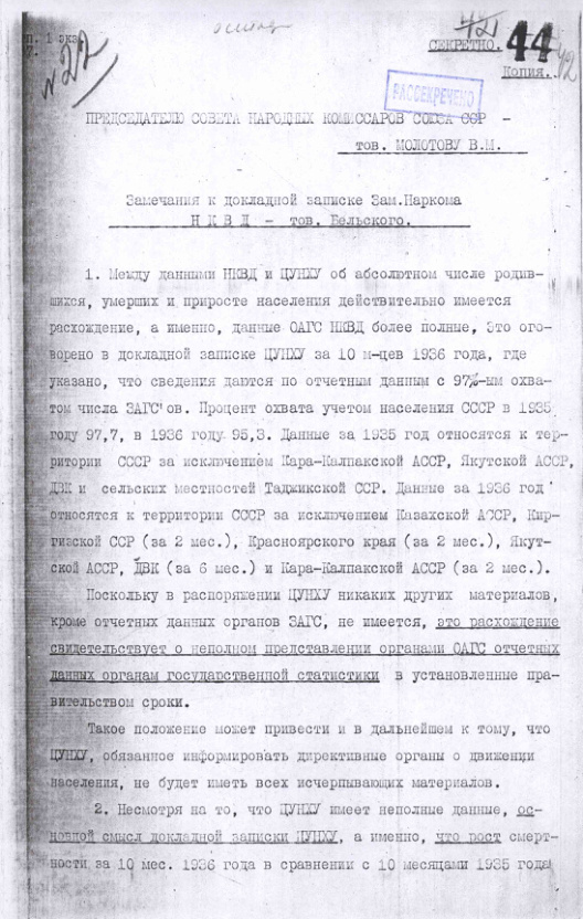Записка начальника ЦУНХУ И.А. Краваля В.М.Молотову с замечаниями к докладной записке зам. наркома НКВД Л.Н. Бельского. 15 марта 1937 г.