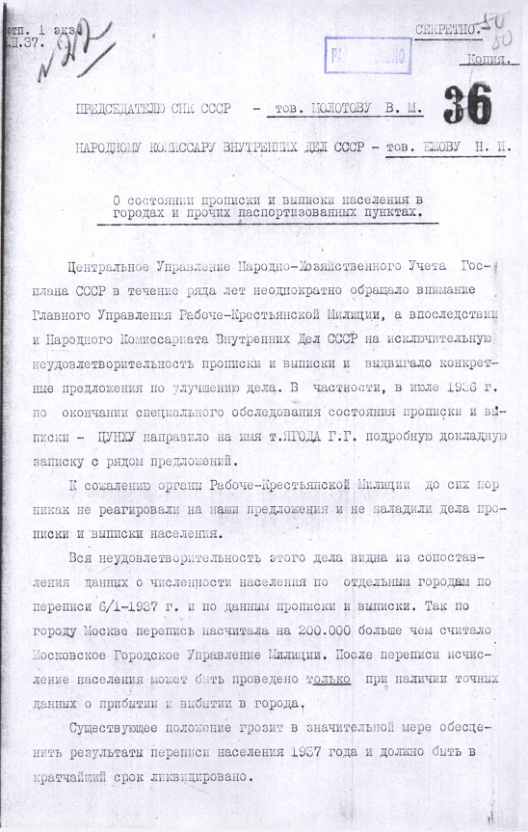 - Записка начальника ЦУНХУ И.А. Краваля В.М. Молотову и Н.И. Ежову о состоянии прописки и выписки в городах и прочих паспортизованных пунктах. 15 марта 1937 г.