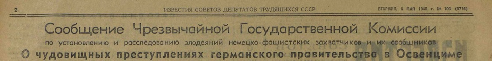 Сообщение Чрезвычайной Государственной Комиссии по установлению и расследованию злодеяний немецко-фашистских захватчиков и их сообщников о чудовищных преступлениях германского правительства в Освенциме. 1945 г.