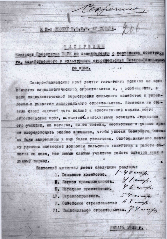 Материалы комиссии Президиума ВЦИК по состоянию сельского хозяйства Северо-Кавказского края. 1933 г.