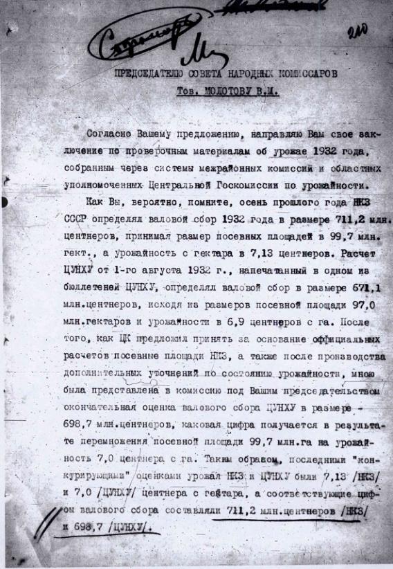 Письмо председателя ЦГК по определению урожайности В.В. Осинского об уточнении размеров урожая зерновых в 1932 г. 28 августа 1933 г.
