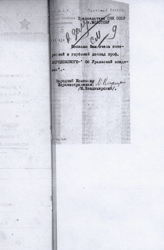 Отчет профессора П.Ф.Здродовского об изучении вспышки "септической ангины" в Ялуторовском районе Уральской обл. 15 июля 1933 г.