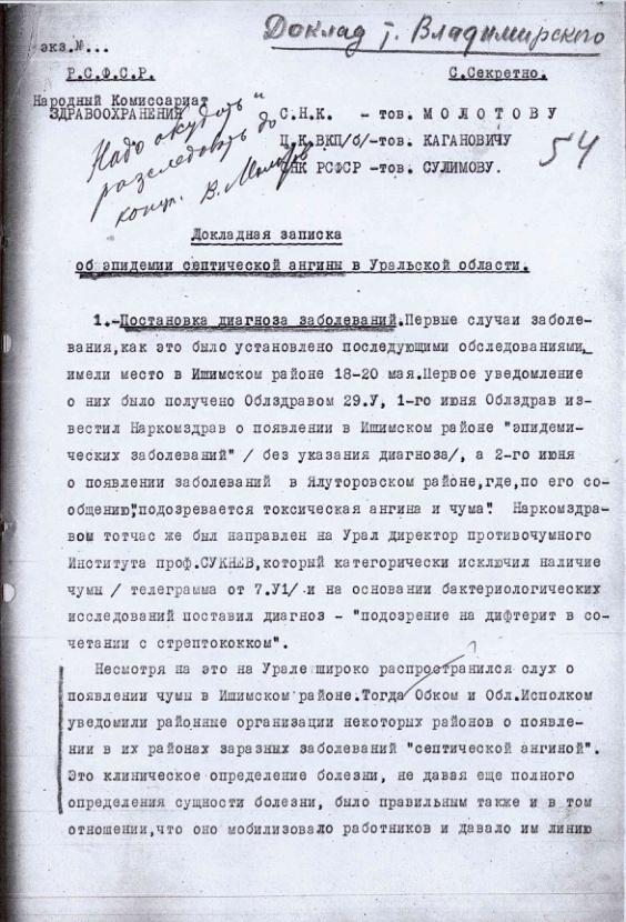 Докладная записка Наркомата Здравоохранения об эпидемии "септической ангины" в Уральской области. 27 июня 1933 г.