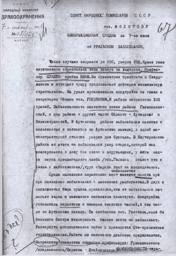 Информационная сводка Наркомата Здравоохранения об уральском заболевании. 7 июня 1933 г.