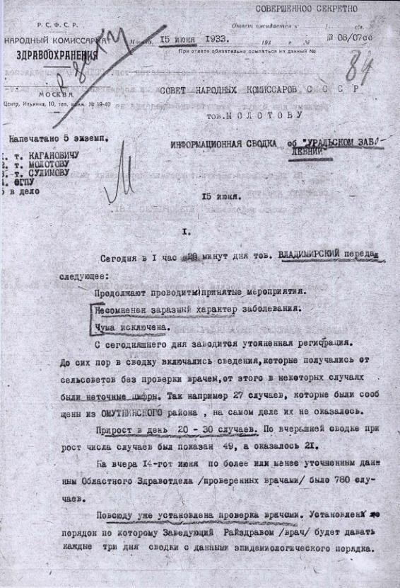 Информационная сводка Наркомата Здравоохранения об уральском заболевании. 15 июня 1933 г.