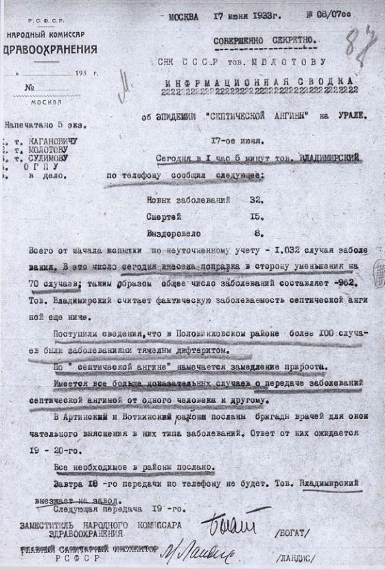 Информационная сводка Наркомата Здравоохранения о заболевании "септической ангиной" на Урале. 17 июня 1933 г.