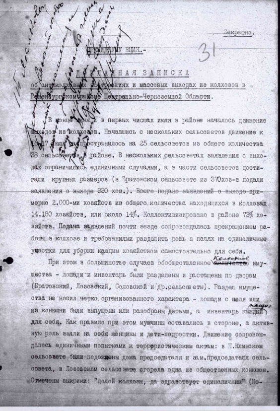 - Докладная записка внештатного инструктора Президиума ВЦИК Малкова об антиколхозных настроениях и массовых выходах из колхозов в Раненбургском районе ЦЧО. 27 июля 1932 г.
