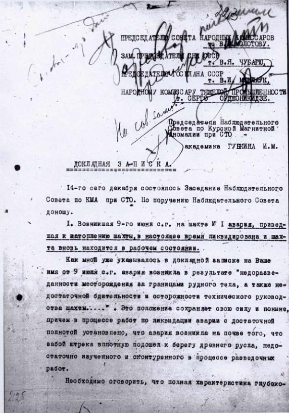Докладная записка Председателя Наблюдательного совета при Курской магнитной аномалии при СТО СССР академика И.М.Губкина. 17 июля 1936 г.