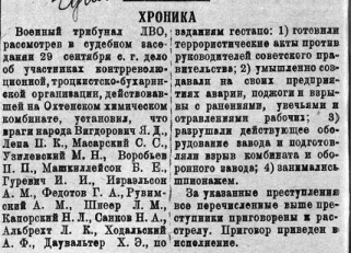 Приговор Военного Трибунала ЛВО по делу контрреволюционной организации на Охтенском химкомбинате. 29 сентября 1937 г.