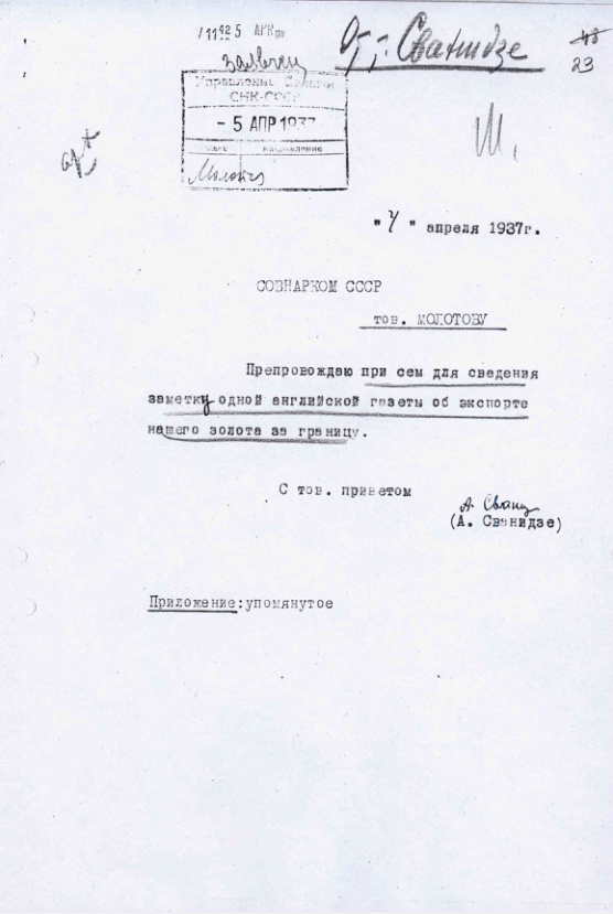 - Сообщение Заместителя Председателя Правления Государственного Банка СССР А.С. Сванидзе с обзором зарубежной прессы об экспорте золота из СССР. 4 апреля 1937 г.