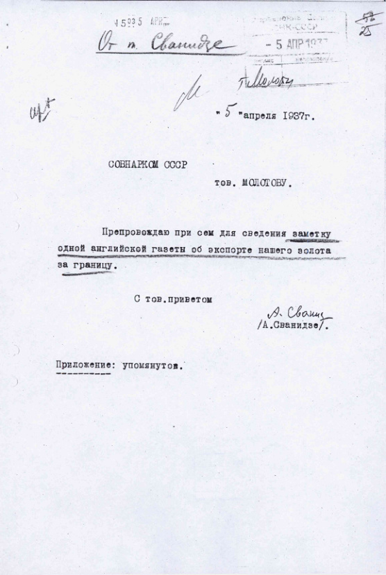 - Сообщение Заместителя Председателя Правления Государственного Банка СССР А.С. Сванидзе с обзором зарубежной прессы об экспорте золота из СССР. 5 апреля 1937 г.