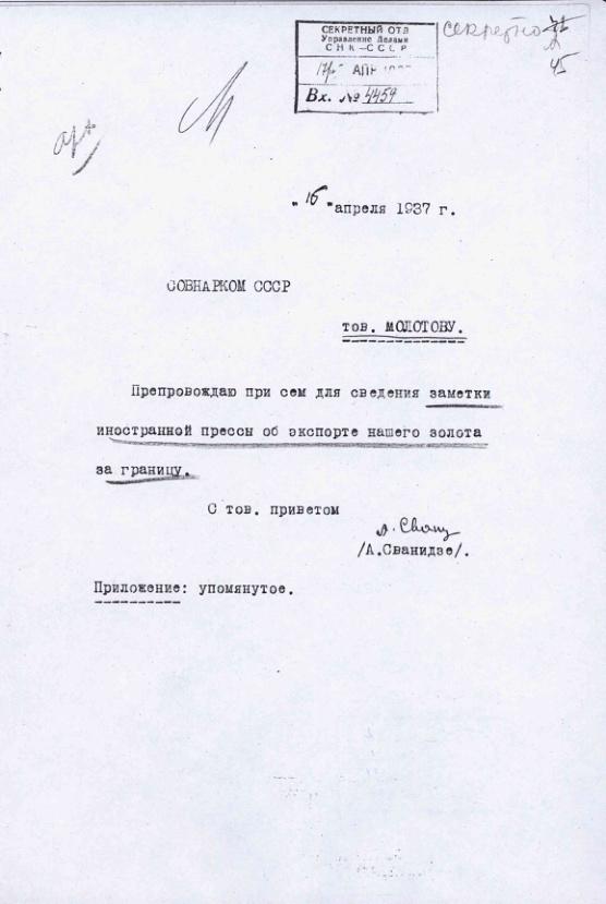 - Сообщение Заместителя Председателя Правления Государственного Банка СССР А.С. Сванидзе с обзором зарубежной прессы об экспорте золота из СССР. 16 апреля 1937 г.