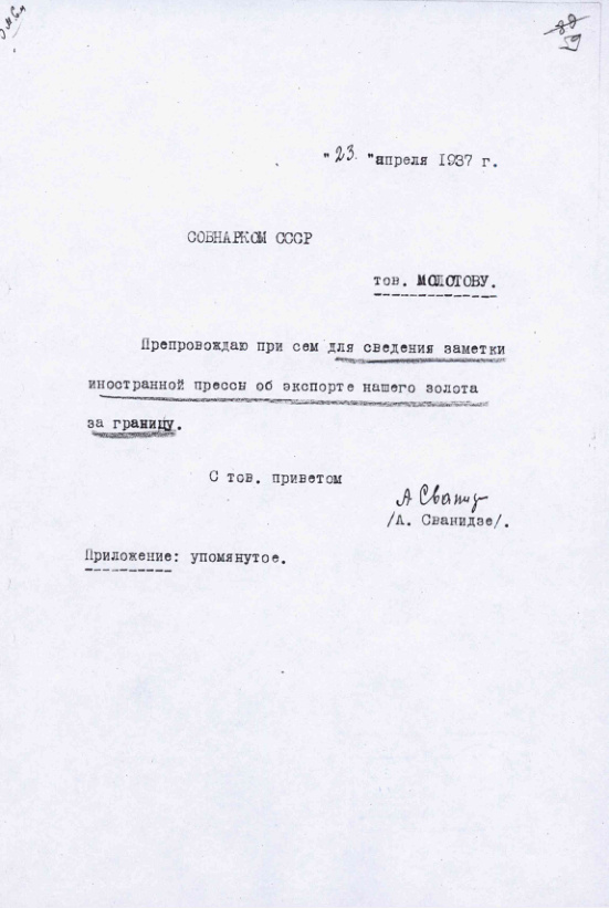 - Сообщение Заместителя Председателя Правления Государственного Банка СССР А.С. Сванидзе с обзором зарубежной прессы об экспорте золота из СССР. 23 апреля 1937 г.