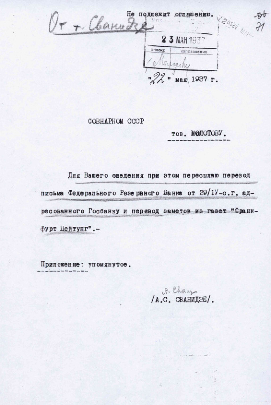 - Сообщение Заместителя Председателя Правления Государственного Банка СССР А.С. Сванидзе с переводом письма Федерального Резервного Банка и обзором зарубежной прессы об экспорте золота из СССР. 22 мая 1937 г.